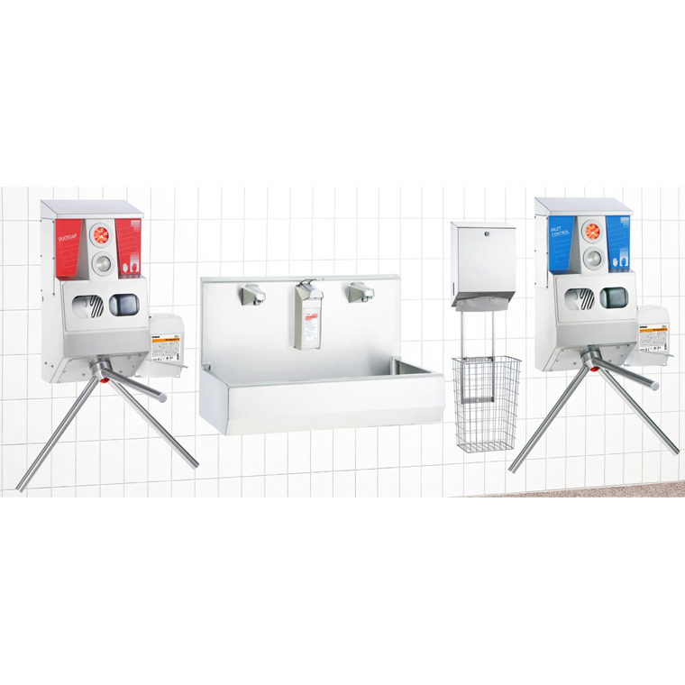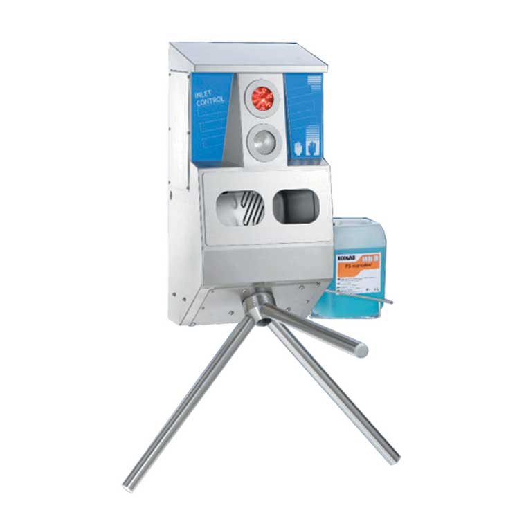 El acceso a las zonas sensibles de producción sólo se produce a través de un torniquete motorizado después de la desinfección intensiva de las manos. El avance del proceso de acceso se visualiza por medio de un sistema de semáforos. Puede combinarse con todos los sistemas de acceso de ITEC que limpian y desinfectan las suelas al pasar por ellos.