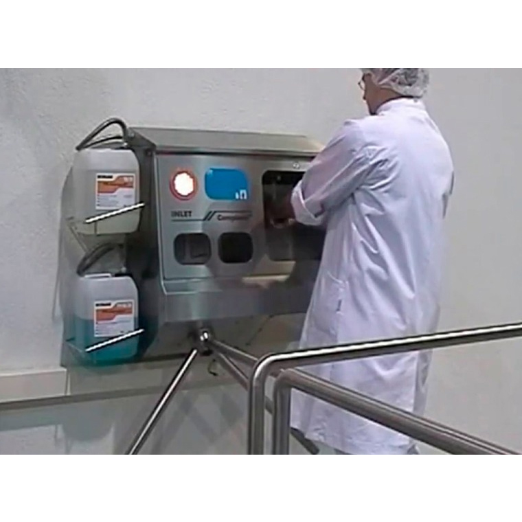 Completa Higiene de las manos en el punto de acceso a las áreas de producción mediante una unidad compacta que combina un punto de lavado de manos, con dispensadores completamente automáticos de jabón y desinfectante líquido y un torniquete motorizado.