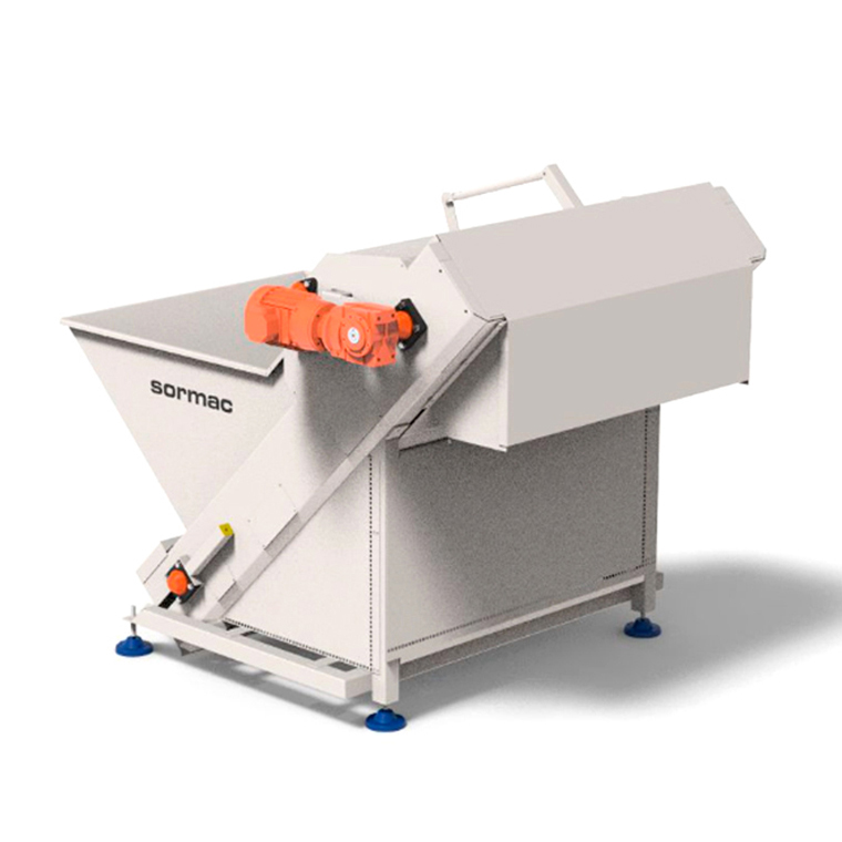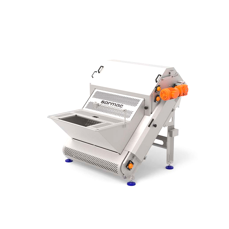 Sirve para cortar grandes cantidades de zanahorias a un tamaño fijo predeterminado. Los pedazos de un tamaño inferior se retiran por una cinta vibratoria.