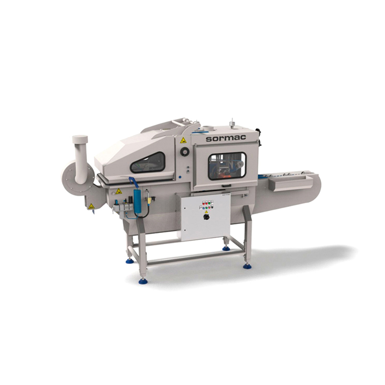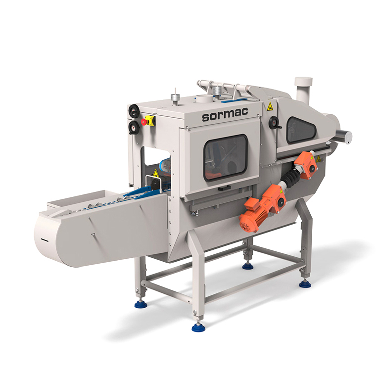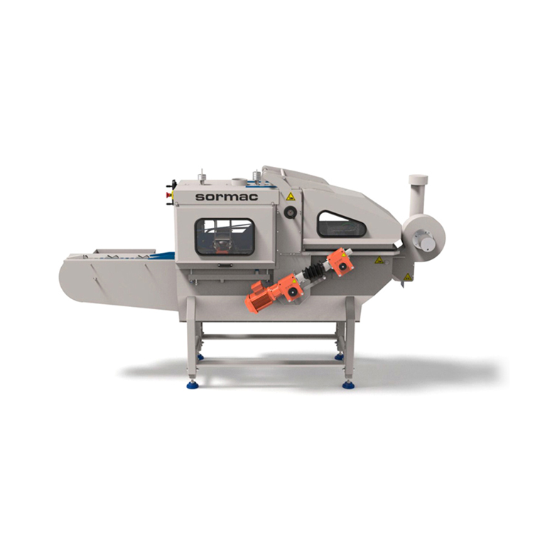 Las cebollas se colocan en la posición horizontal correcta sobre la cadena transportadora. Las cuchillas giratorias decapitan las cebollas, las desmenuzan y luego las cortan por delante y por detrás. Al final de la cadena transportadora, las cebollas son recogidas por dos brazos con abrazaderas giratorias y se separan mediante una potente corriente de aire.